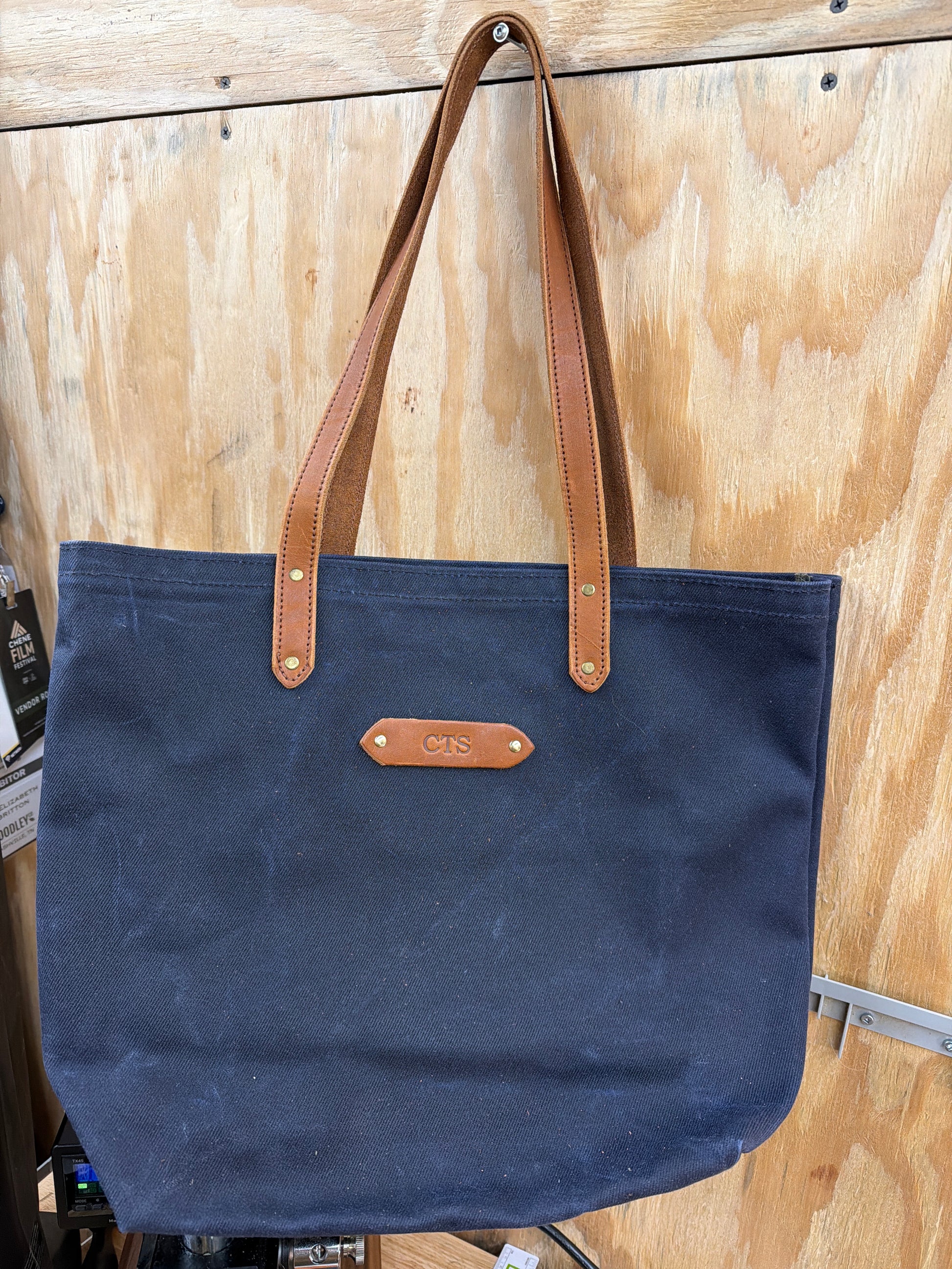 Tote can be personalized with a hot stamped leather badge. Refer to photos for badge designs.