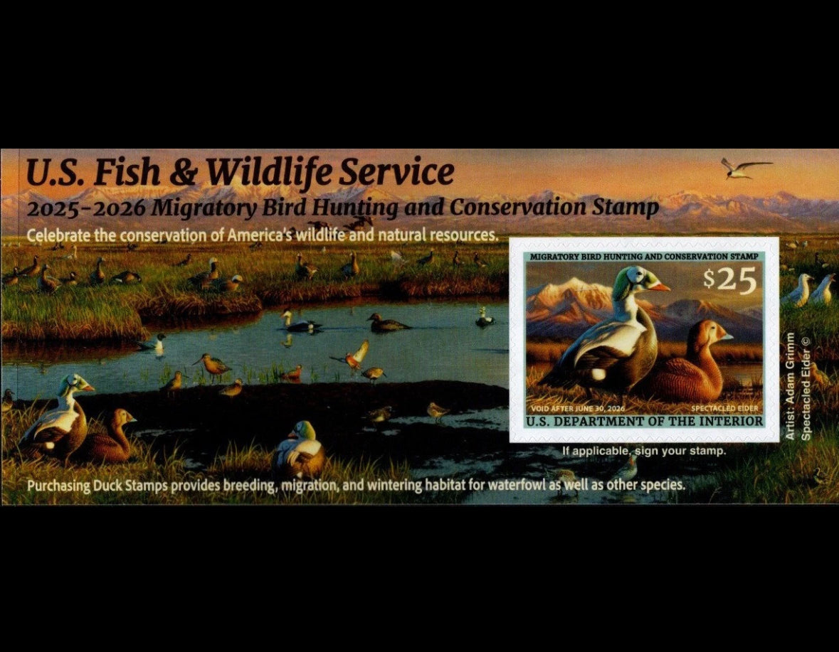 The 2025-2026 stamp features a Spectacled Eider painted by Adam Grimm. Adam is an accomplished wildlife artist, notching his third Duck Stamp Contest win with this pair of Spectacled Eiders. His work can found on his Website.