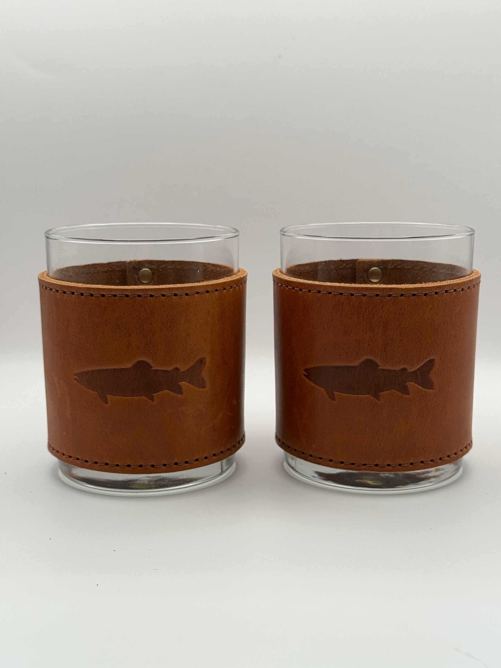 13.25oz rocks glasses with stitched leather cuff featuring a debossed trout. Choose from a Single, a Pair or Set of Four. Search the site for other designs plain, monogrammed, or with one for our logos